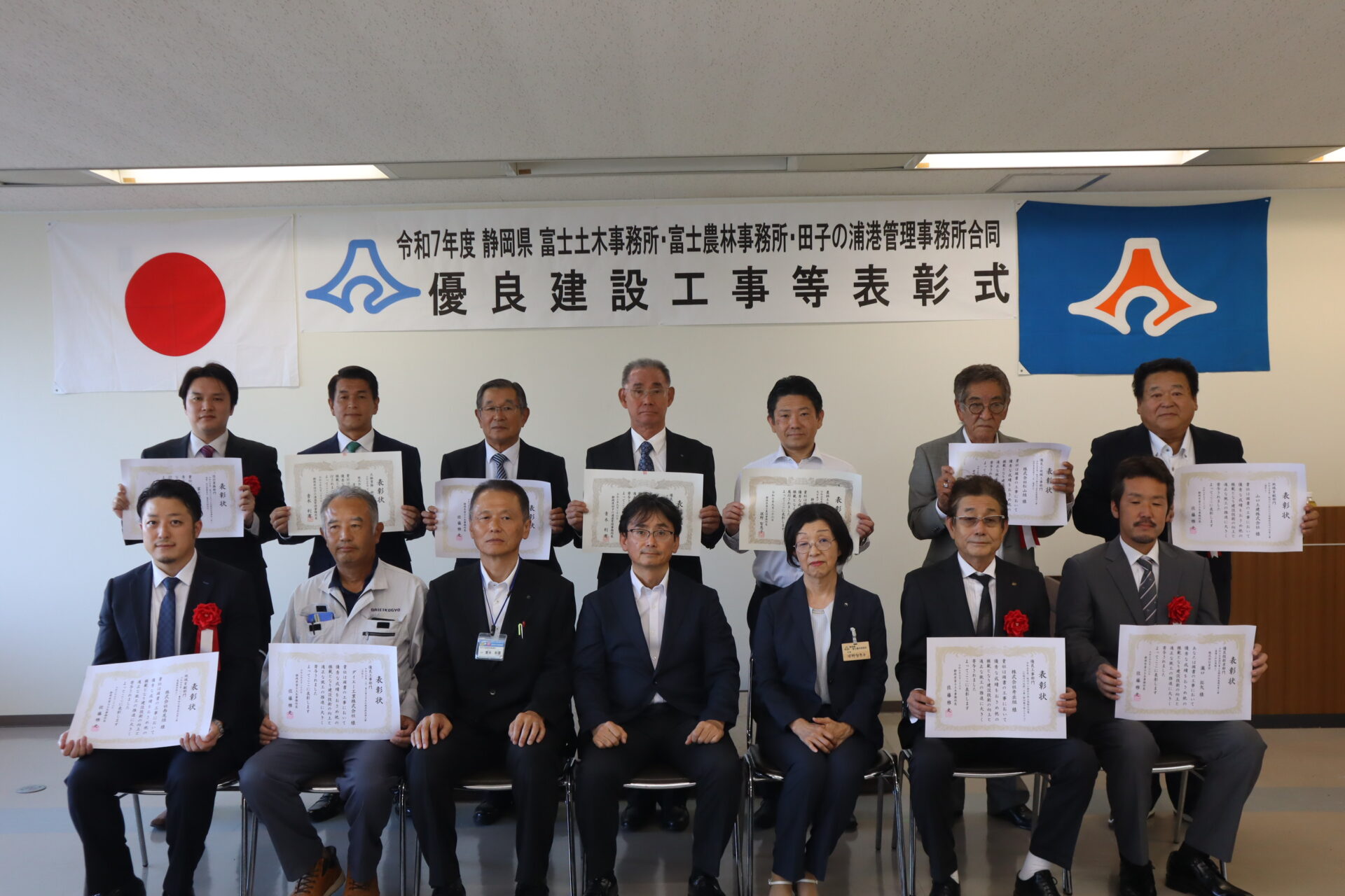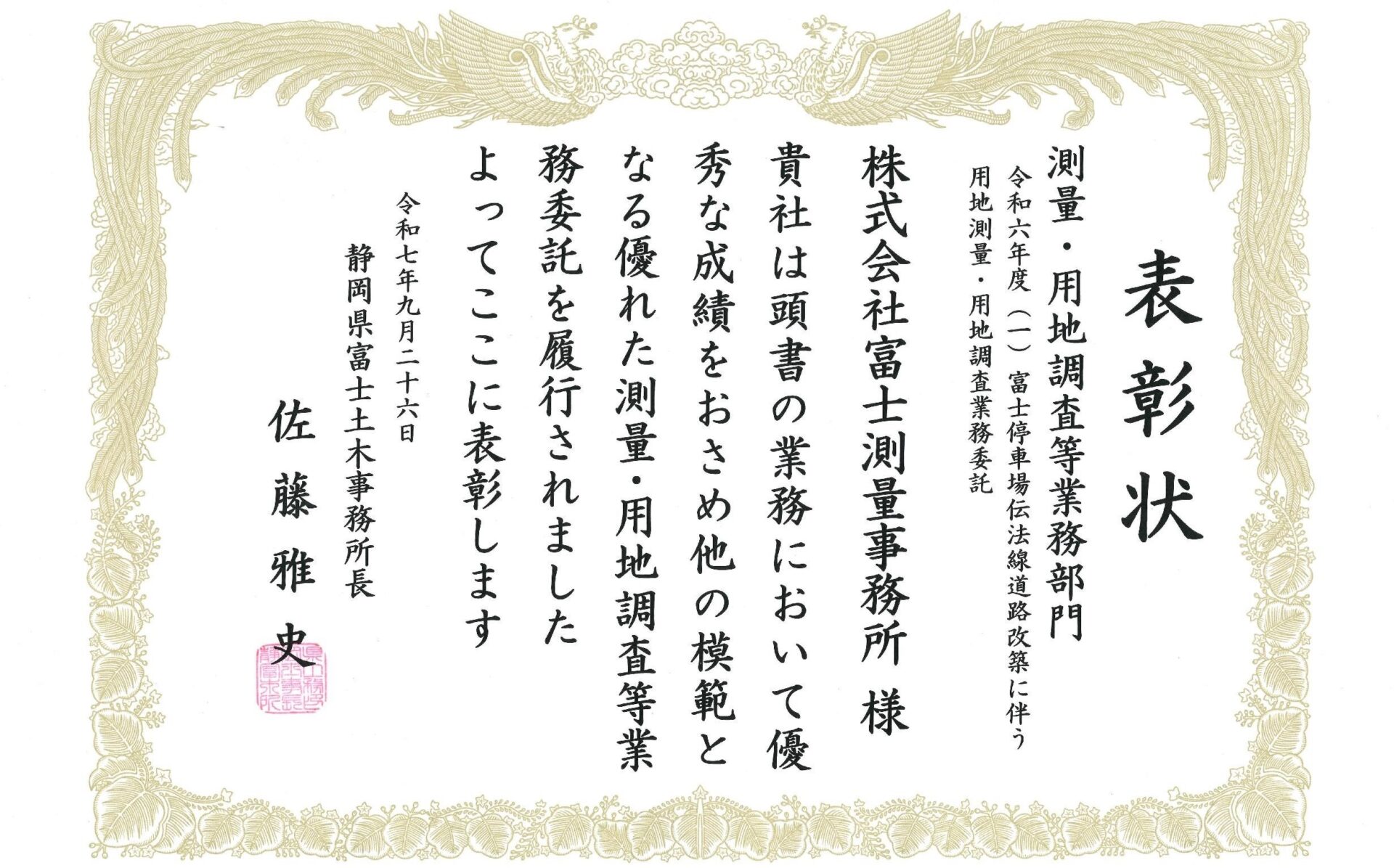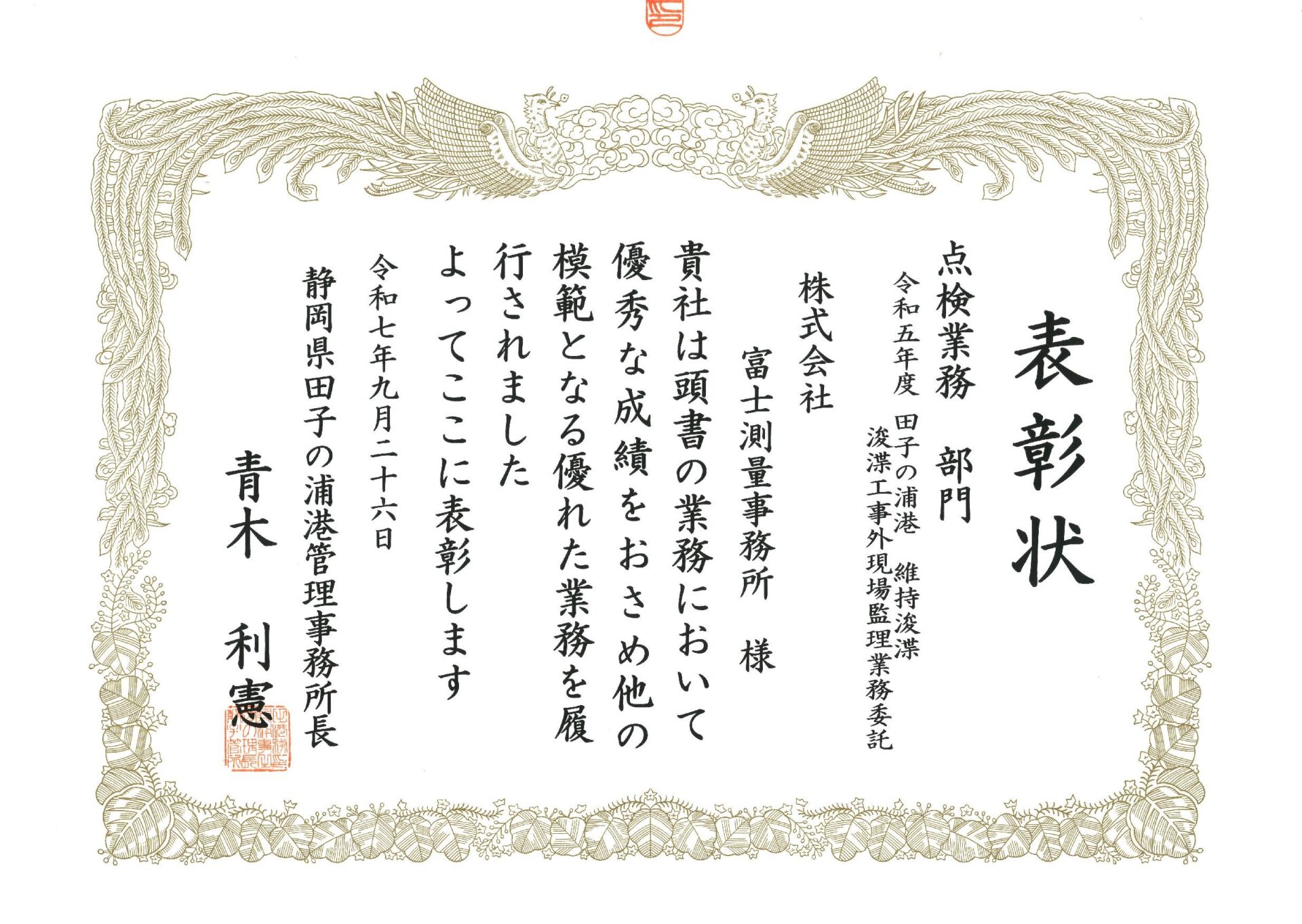 202509/26 静岡県より優良業務委託表彰を受賞 静岡県富士土木事務所より優良業務委託表彰を受賞いたしました。 静岡県田子の浦港管理事務所より優良業務委託表彰を受賞いたしました。 今後とも事業を通じて地域の安全・発展に貢献してまいります。